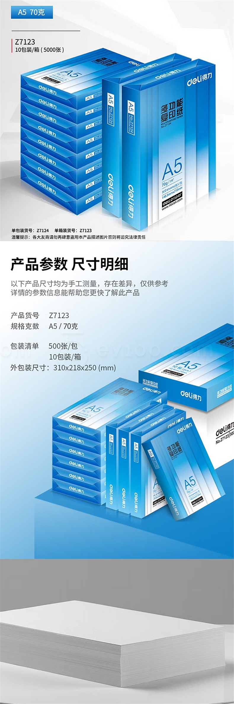 得力 铂锐复印纸A5 70g 10包/箱 Z7123