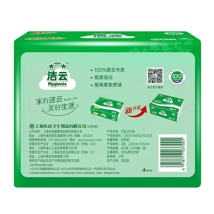 产品升级:产品10370001整箱规格42包/箱升级为 10370002整箱规格30包/箱;生产工艺由原“低压花”调整至“高压花”,由原先单层400张/包升级为双层200抽(400张)/包,其余产品信息不变。新老包装交替发货。